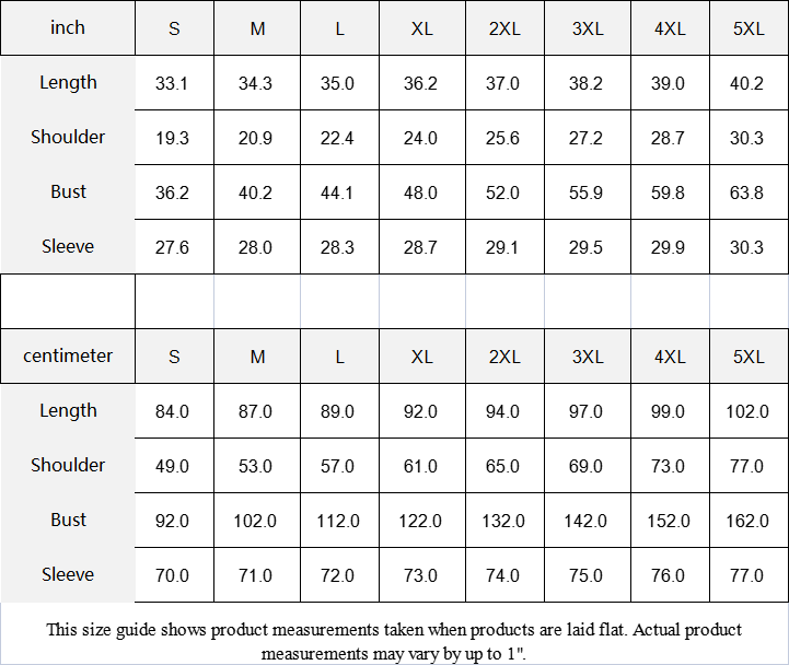 inch | S | M | L | XL | 2XL | 3XL | 4XL | 5XL |